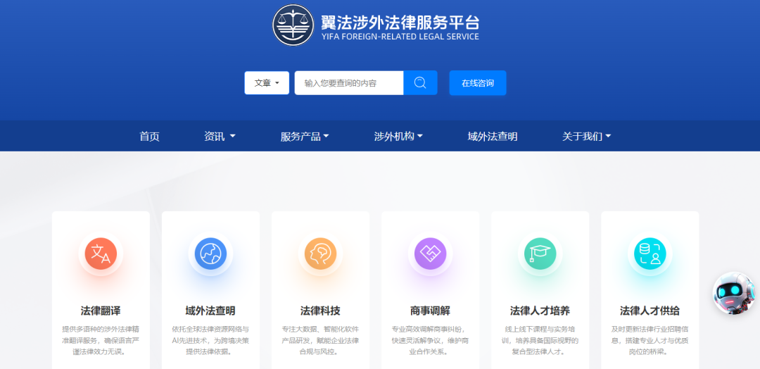 学府“翼法涉外法律服务平台”是在司法行政机关的指导下,探索精准把握企事业单位等法律服务群体继续教育需求,自主设计研发的集法律翻译、域外法查明、法律科技、商事调解、法律人才培养与供给等为一体的综合型涉外法律服务平台。