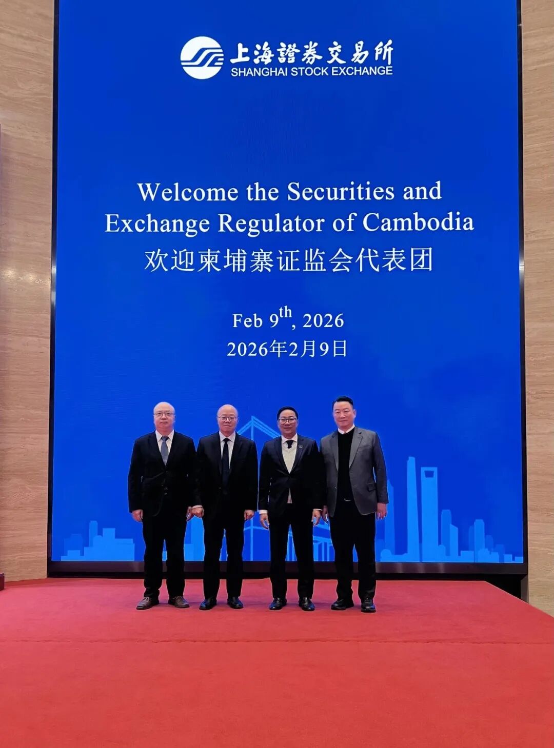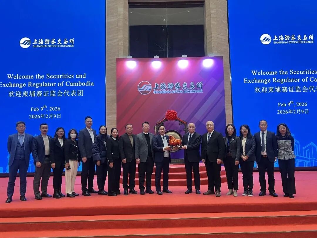 2026年2月8日至2月11日,由柬埔寨证监会副主席H.E. Seang Thirith阁下及柬埔寨证券公司(Cambodia Securities Plc.)董事会主席邓镇岳先生共同率领的金融代表团赴上海开展密集交流,先后拜会上海证券交易所(Shanghai Stock Exchange, SSE),并与中国头部券商国泰海通证券、申万宏源证券高层进行座谈。代表团此行聚焦资本市场制度交流、跨境投融资合作、两地上市路径、债券产品创新与跨境交易互通等议题,释放出中柬资本市场合作的积极信号,标志着柬埔寨资本市场正站上加速发展的新起点。